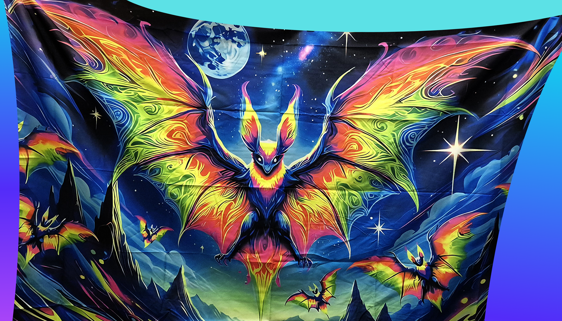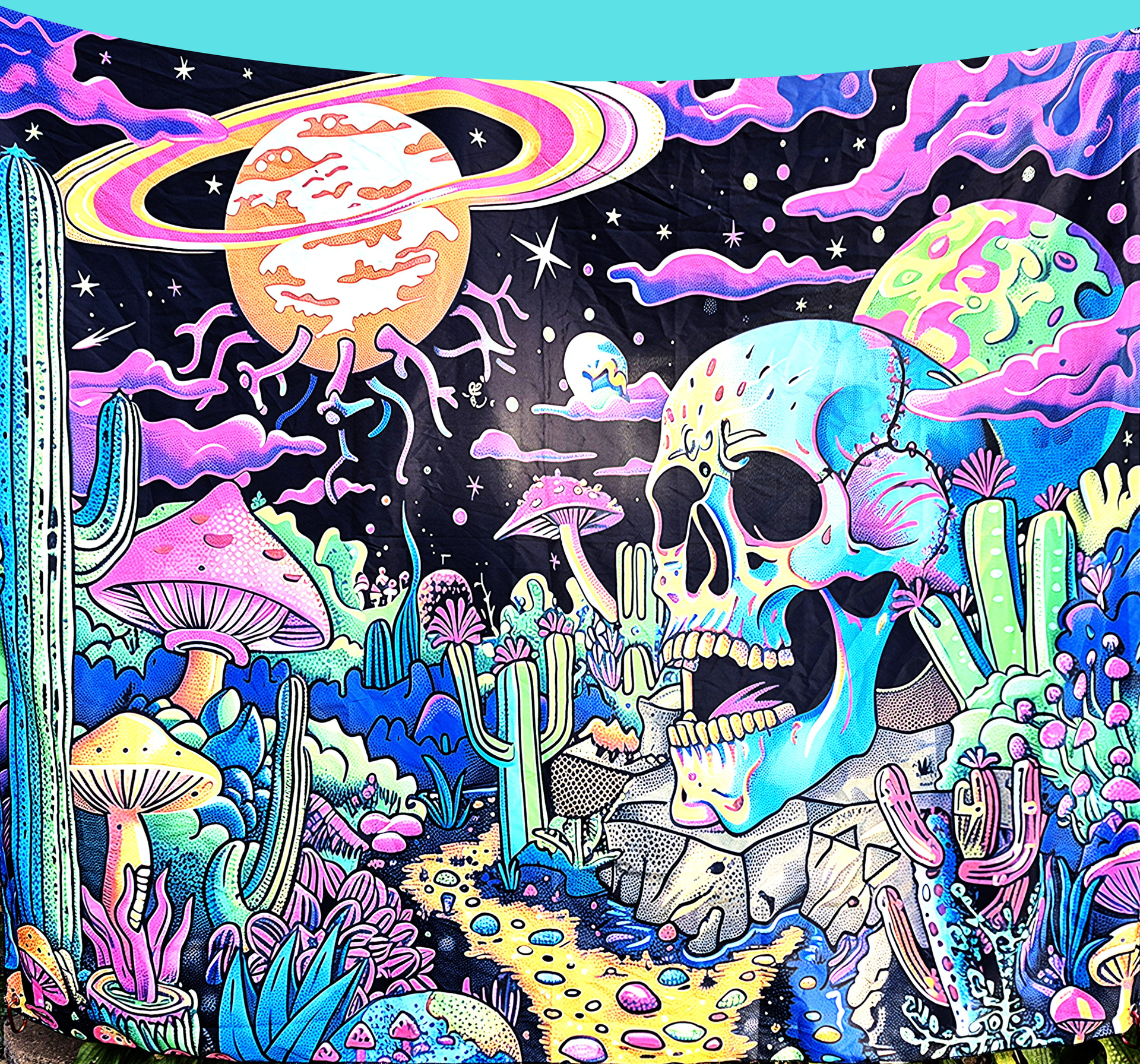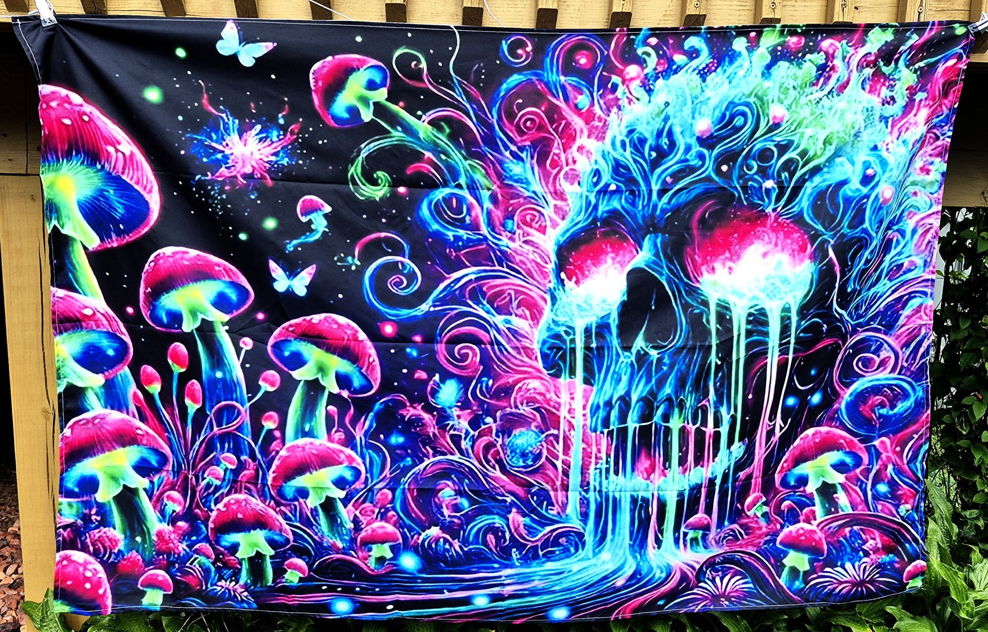 - UV-reactive wall tapestries that transform rooms and festival camps into glowing dreamscapes