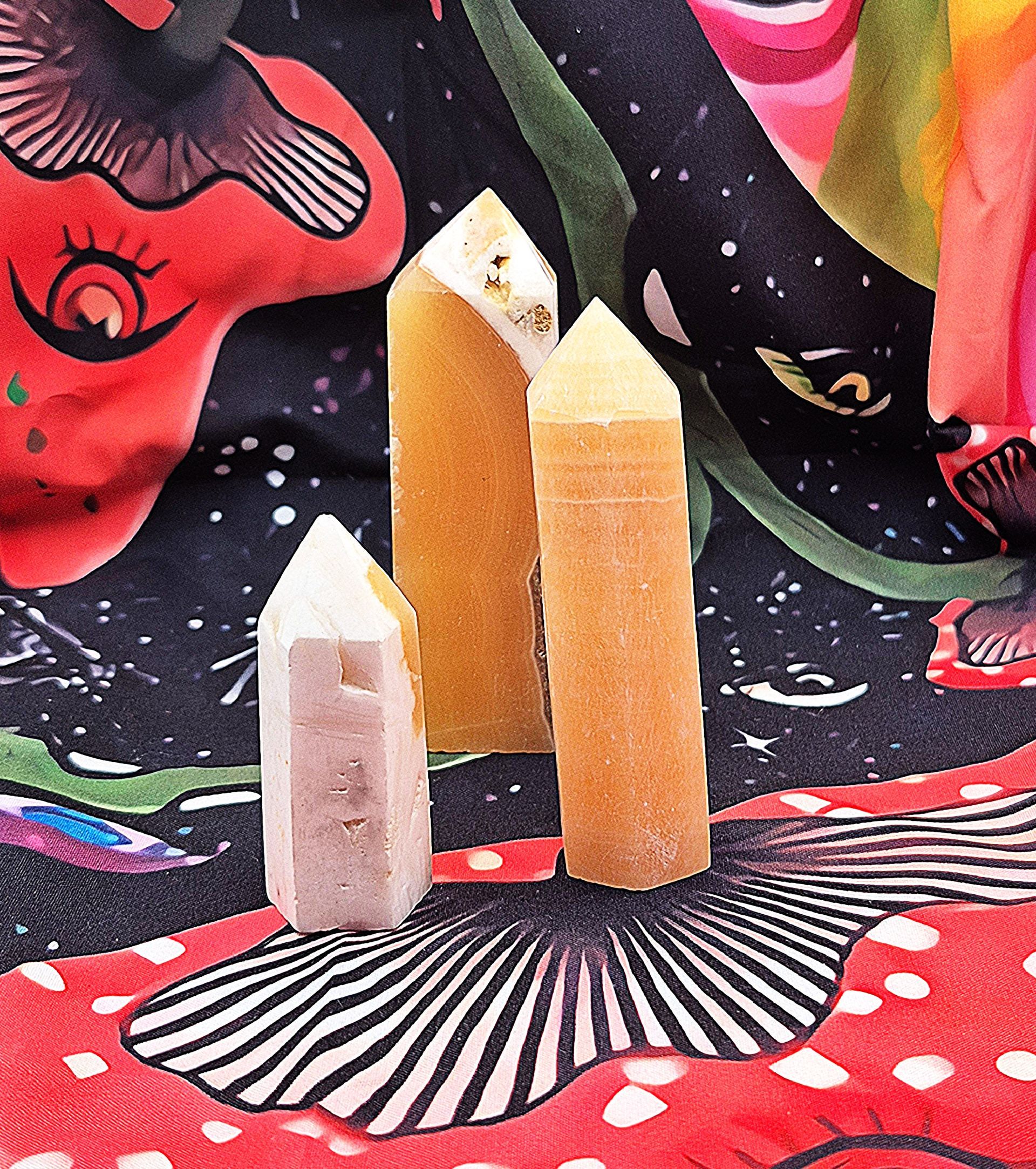 A luminous calcite crystal tower available in 6 cm, 9 cm, or 9.75 cm heights, featuring soft, translucent tones ranging from creamy white to pale yellow or honey hues. Polished to a smooth, glossy finish and cut into a sleek, pointed shape, the tower highlights calcite’s natural striations and subtle internal glow. Each piece is unique, with gentle variations in color and texture that add depth and character. Balanced and display-ready, this calcite tower makes a bright, uplifting accent for shelves, desks, or meditation spaces, bringing warmth, clarity, and natural elegance to any crystal collection.